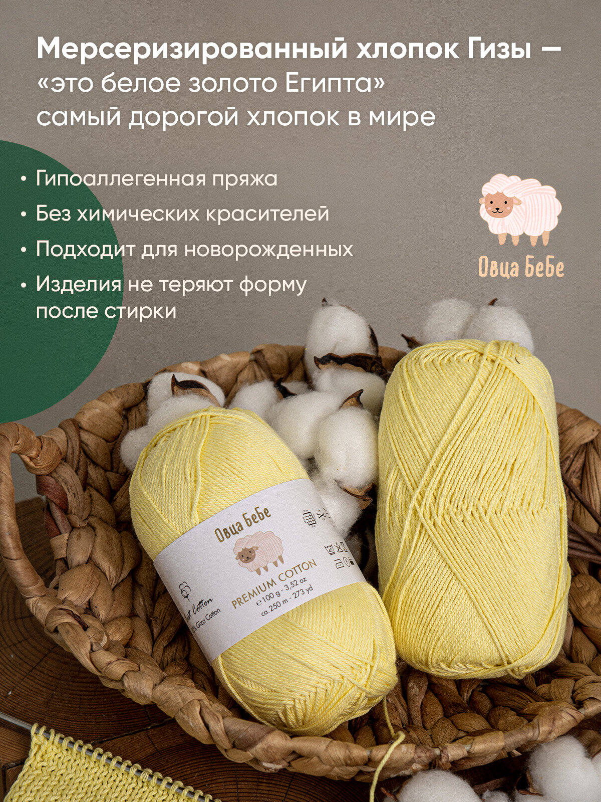 10 цен на Пряжа Premium Cotton Giza, цвет светло-лимонный (набор из 2 шт), 100% хлопок