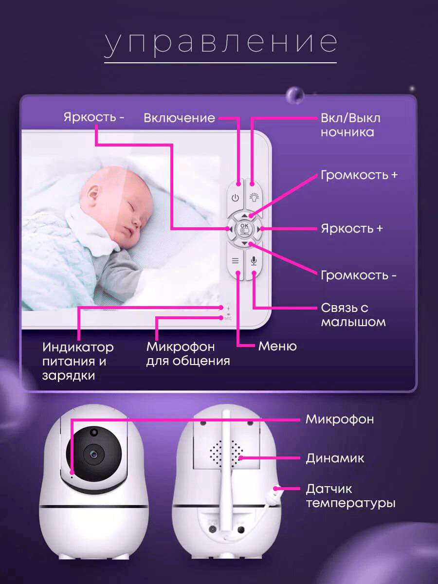 | Особенности | датчик движения, датчик температуры, двусторонняя голосовая связь, работа от сети 220 В, термометр, функция ночного видения |