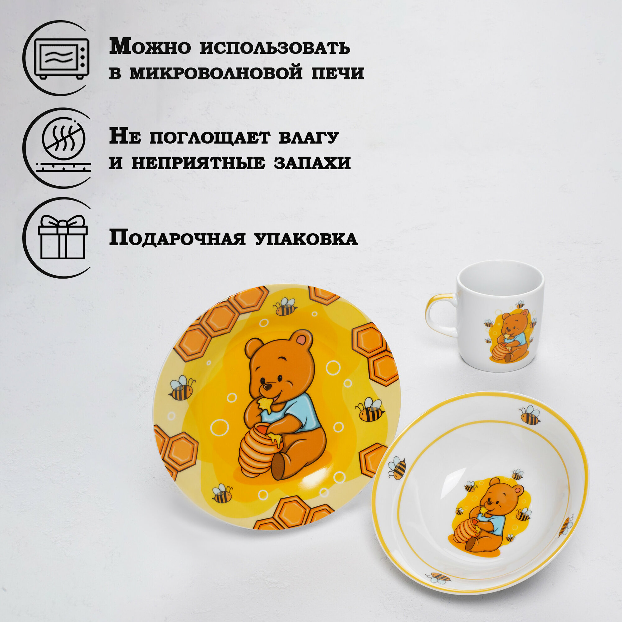 Набор детской посуды из керамики Доляна «Медвежонок и мёд», 3 предмета: кружка 230 мл, миска 400 мл, тарелка d=18 см, цвет белый информация: