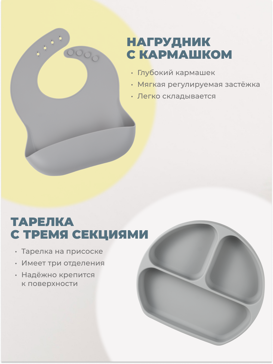 | Комплектация | ложка и вилка - 2 шт; нагрудник силиконовый - 1шт.; Непроливающий поильник 1 шт крышка -1шт.; Глубокая тарелка на присоске -1шт. Тарелка с 3 отделениями на присосках -1шт.; Крышка с трубочкой - 1шт. |