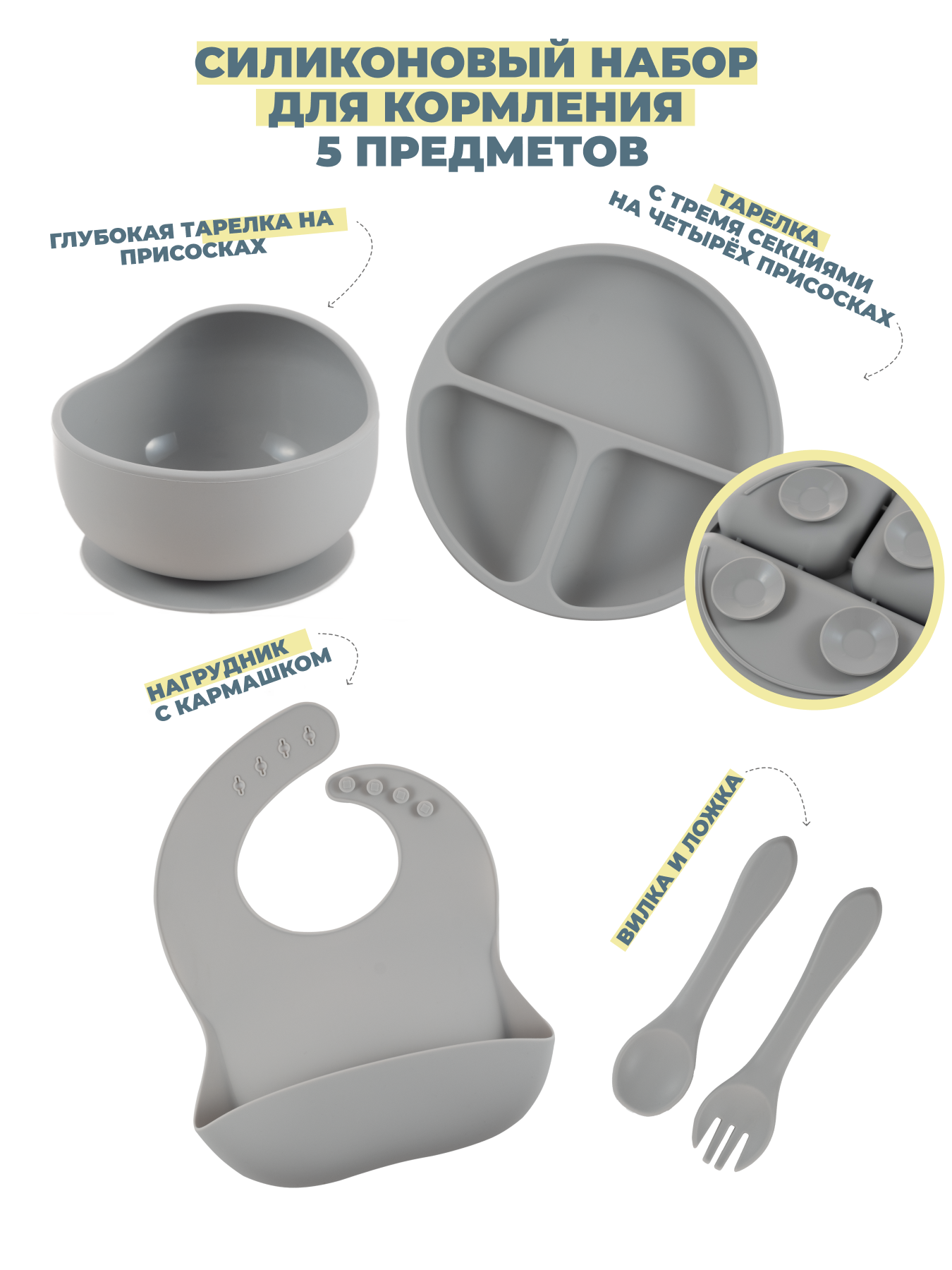 Детский силиконовый набор посуды для кормления малыша 5 предметов информация: