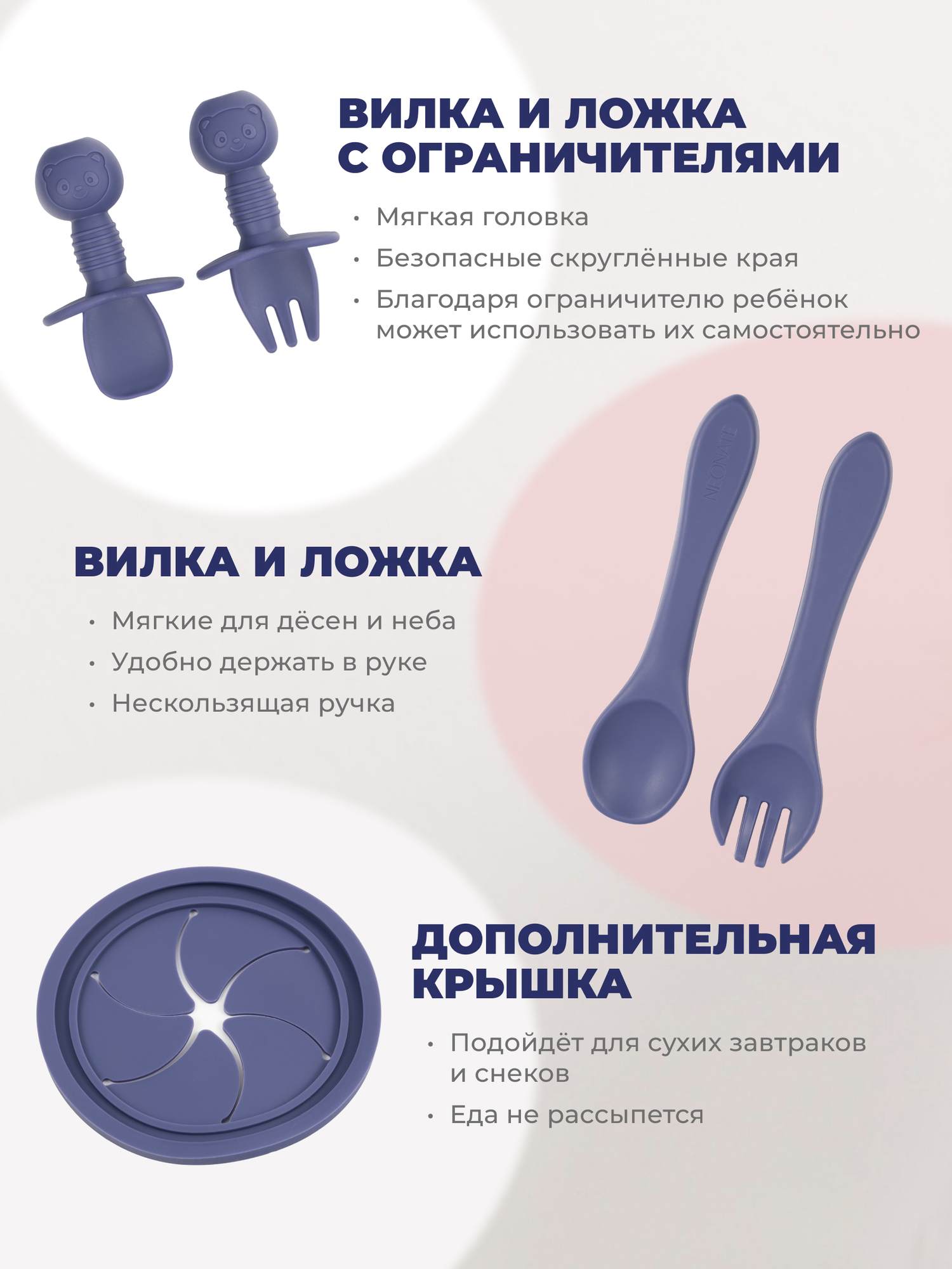 | Комплектация | ложка и вилка - 2 шт; нагрудник силиконовый - 1шт.; Непроливающий поильник 1 шт крышка -1шт.; Глубокая тарелка на присоске -1шт. Тарелка с 3 отделениями на присосках -1шт.; Крышка с трубочкой - 1шт. |