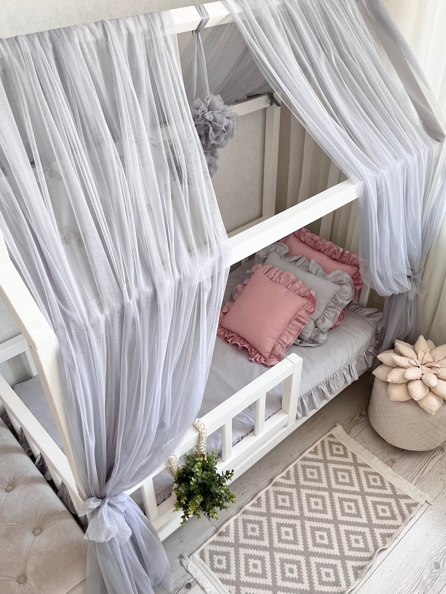 Балдахин на кроватку-домик с помпонами, фатин, серый холодный информация: