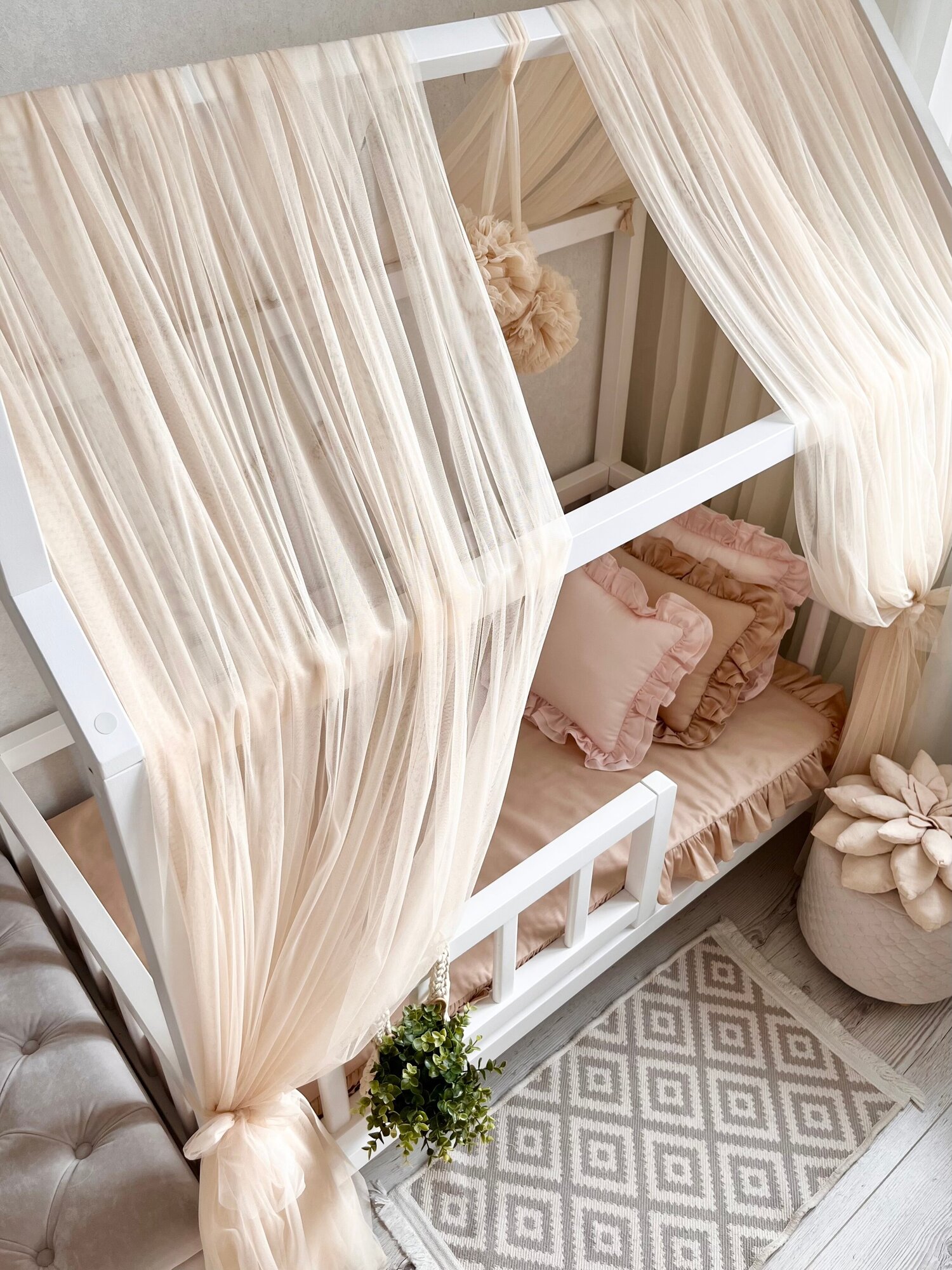 Балдахин на кроватку-домик с помпонами, фатин, бежевый информация: