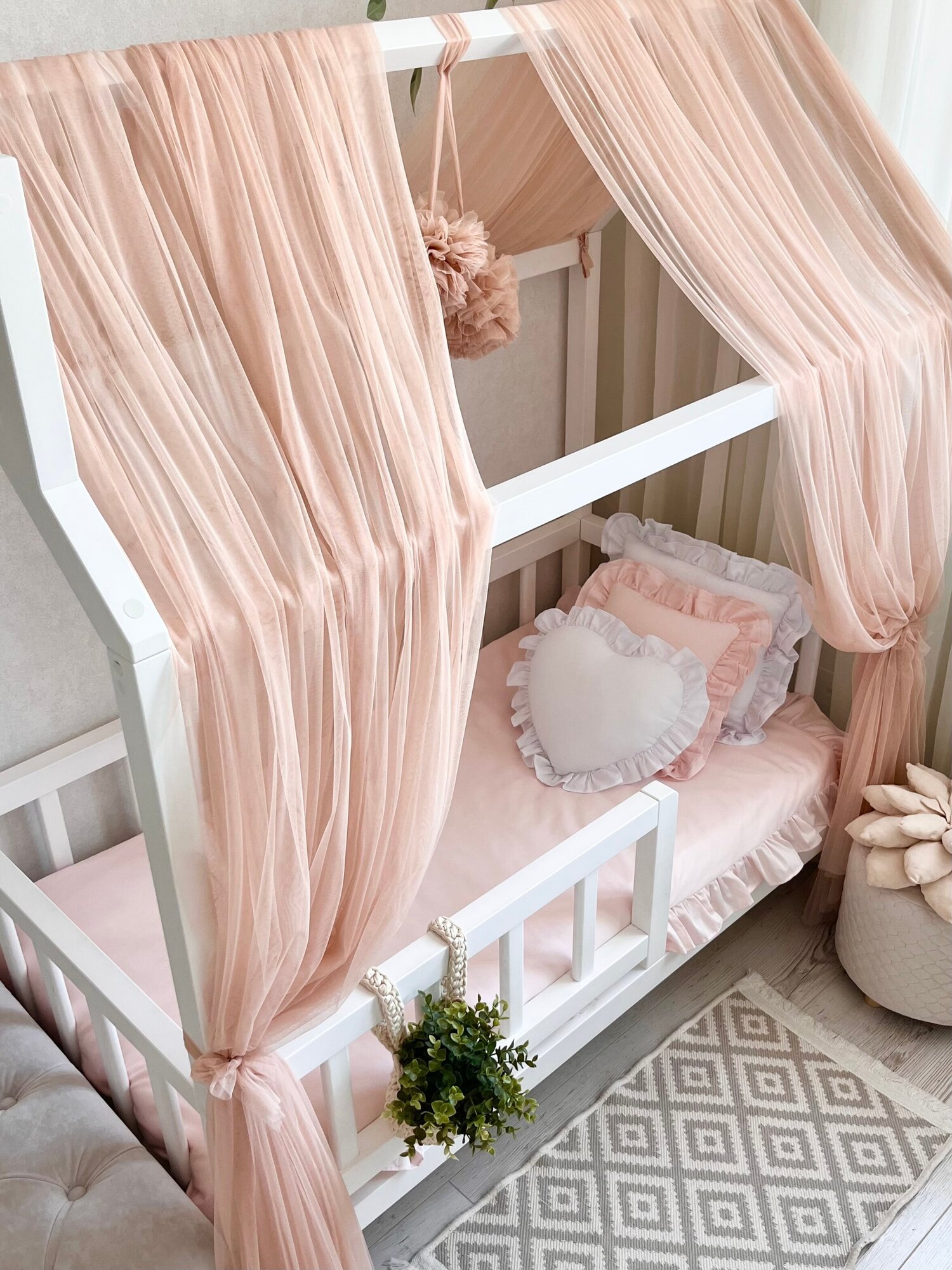 Балдахин на кроватку-домик с помпонами, фатин, пудровый