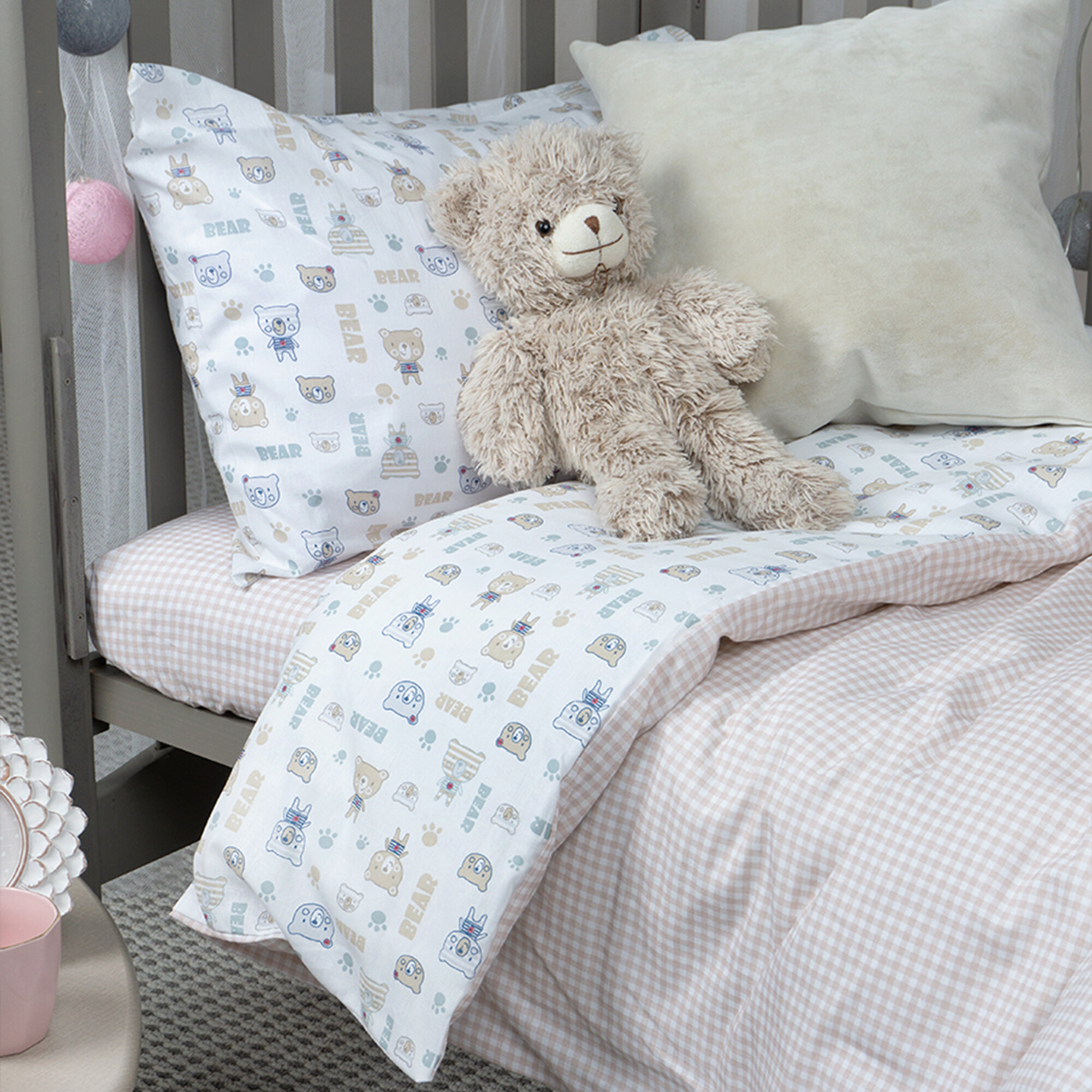 Комплект постельного белья в кроватку Galtex компаньон простыня на резинке: Полосатые мишки на белом фоне/Клеточка бежевый информация: