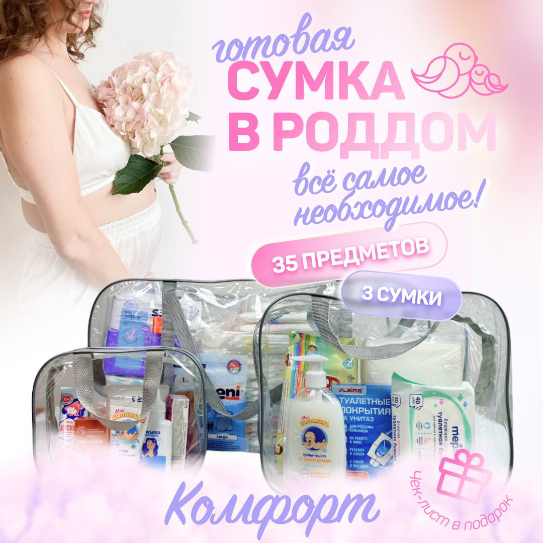 10 цен на Сумка в роддом готовая для мамы и малыша с наполнением, 35 предметов, 3 сумки, комплектация "Комфорт", прозрачная