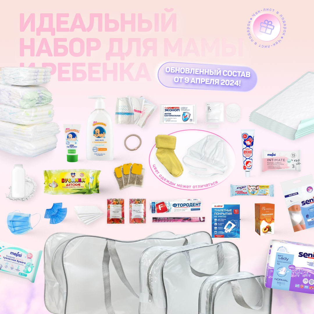 | Состав набора | бахилы, влажная туалетная бумага, влажные салфетки, мыло, носочки для новорожденного, одноразовые маски, одноразовые покрытия на сиденье унитаза, пеленки для мамы, пеленки для новорожденного, подгузники, прокладки для груди, прокладки послеродовые, трусики, шапочка для новорожденного |