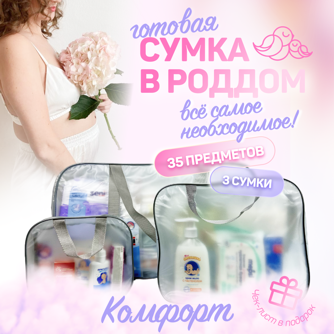 Сумка в роддом готовая для мамы и малыша с наполнением, 35 предметов, 3 сумки, комплектация "Комфорт", прозрачная 4 814 ₽