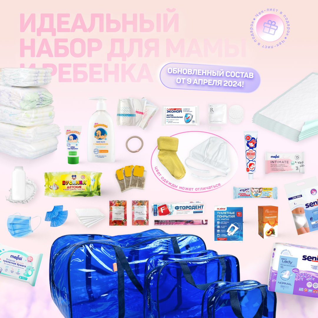 | Состав набора | бахилы, влажная туалетная бумага, влажные салфетки, мыло, носочки для новорожденного, одноразовые маски, одноразовые покрытия на сиденье унитаза, пеленки для мамы, пеленки для новорожденного, подгузники, прокладки для груди, прокладки послеродовые, трусики, шапочка для новорожденного |