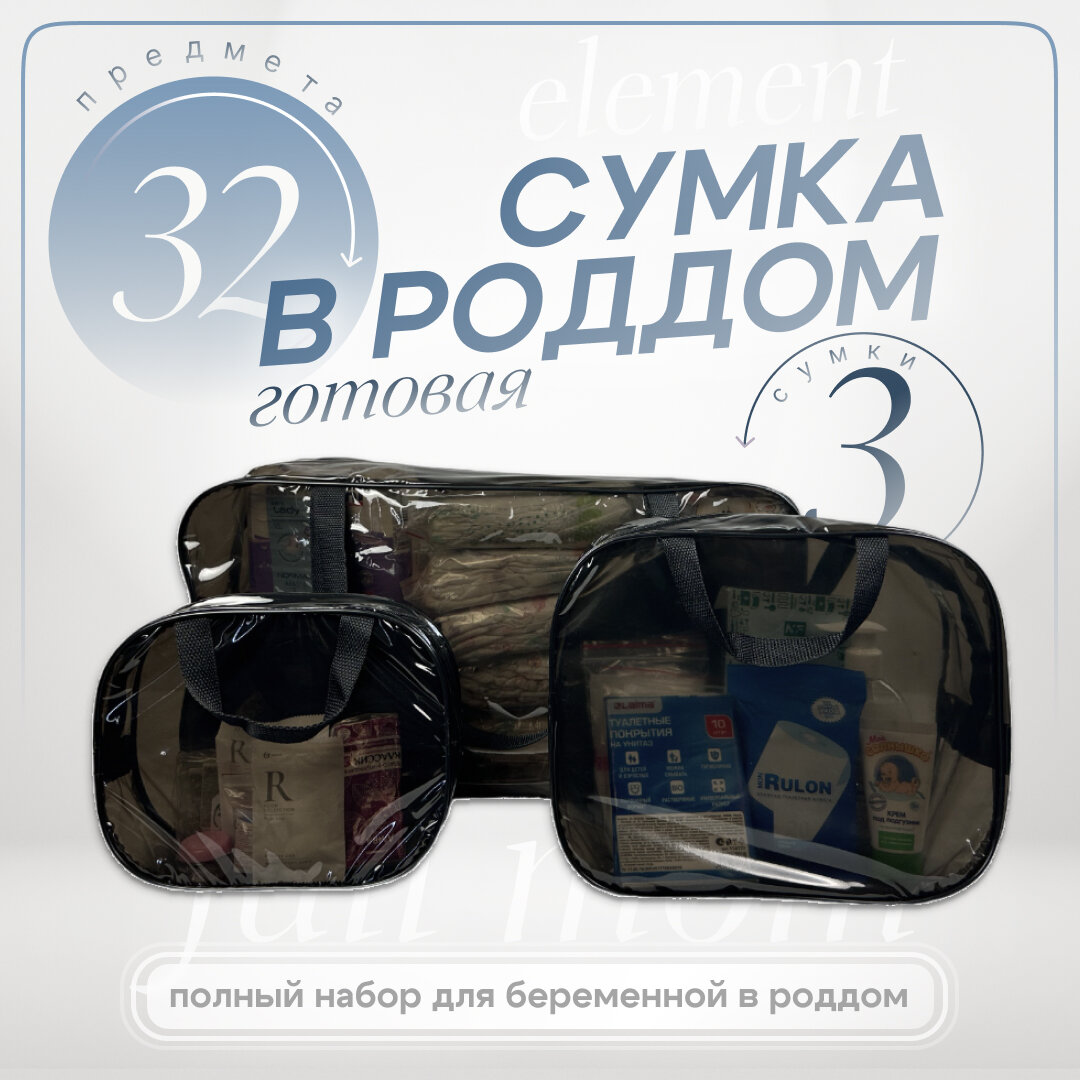 10 цен на Сумка в роддом готовая для мамы и малыша с наполнением, Full mom комплектация Element, 32 предмета, 3 сумки, черная