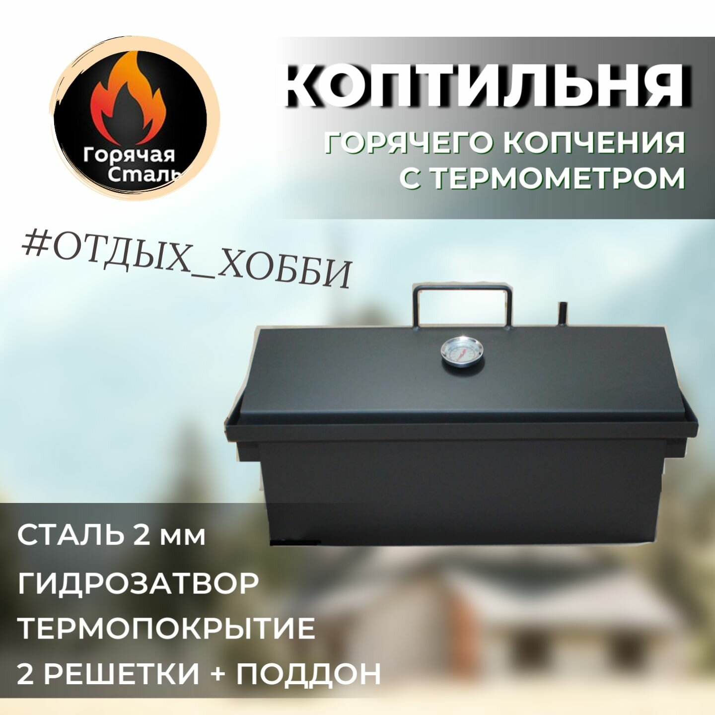 Коптильня с термометром горячего копчения, сталь 2 мм, 50х25х32 см, домашняя, двухъярусная, крышка с гидрозатвором. информация:
