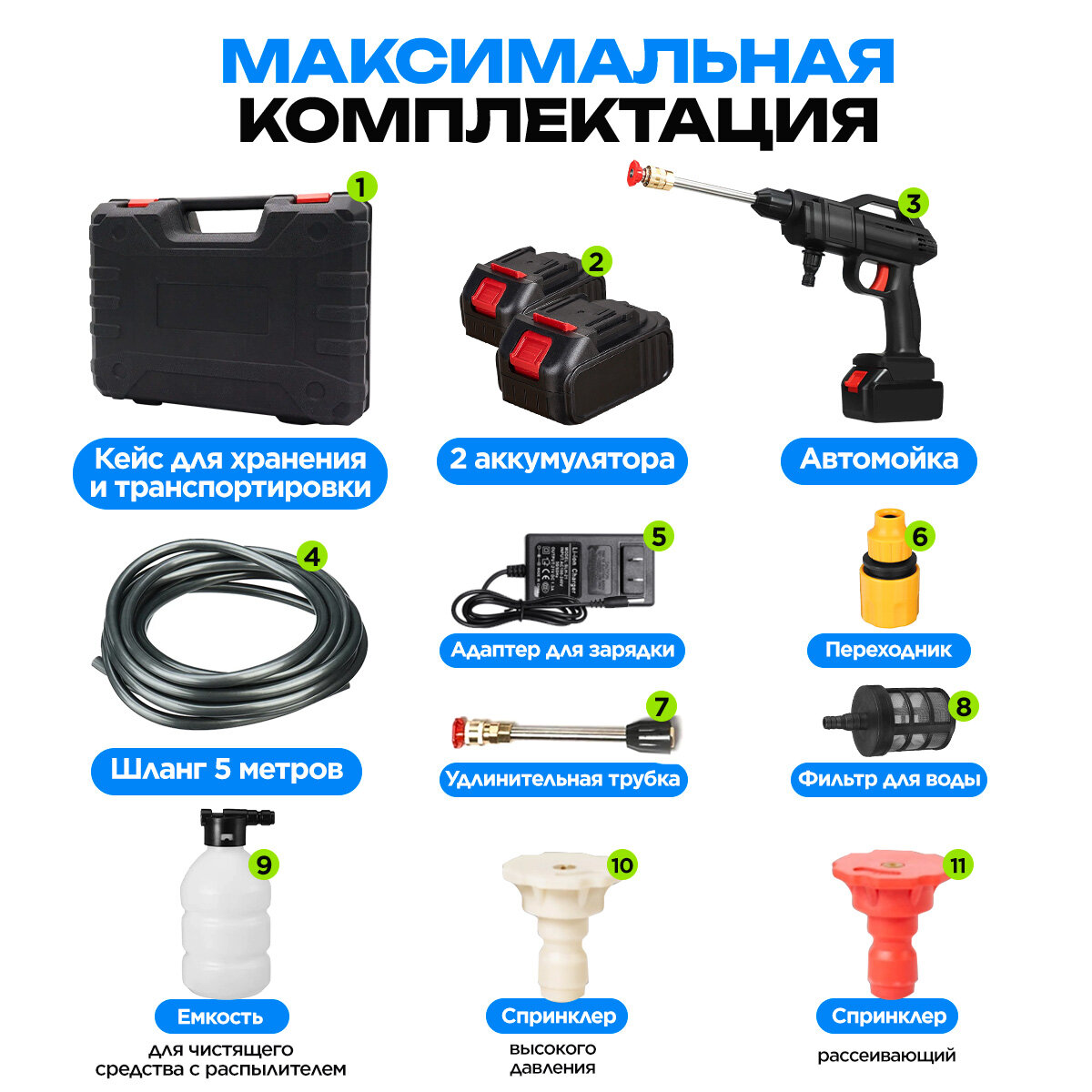 | Подробная комплектация | автомойка, 2 аккумулятора, кейс для хранения, шланг 5 м, адаптер для зарядки, переходник, удлинительная трубка, фильтр для воды, спринклер 2 шт, емкость для чистящего средства с распылителем |