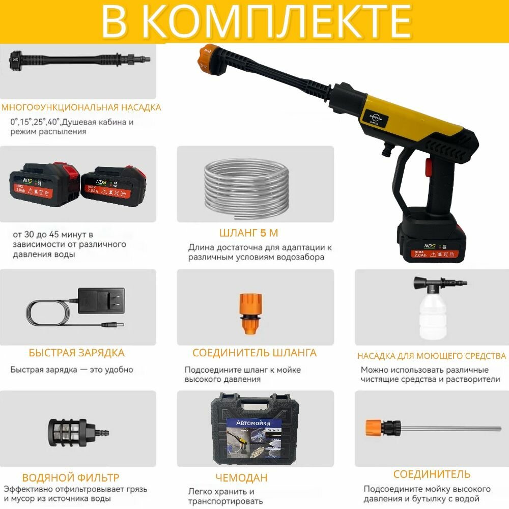 | Подробная комплектация | Мойка аккумуляторная- 1 шт. Кейс для хранения и переноса - 1 шт. Фильтр-1шт. Аккумулятор - 2 шт. Струйная трубка - 1 шт. Пенообразователь - 1шт. Шланг 5 м - 1 шт. Быстросъемный адаптер - 1 шт. Зарядное устройство-1шт. Инструкция |