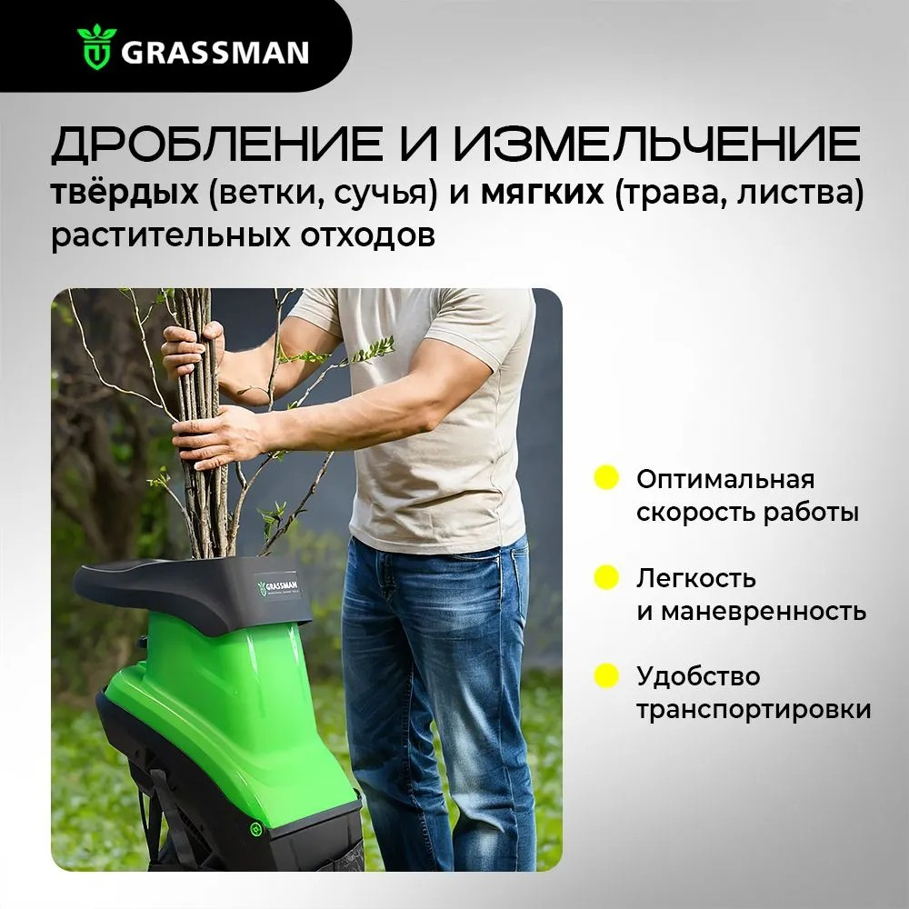10 цен на Измельчитель электрический GRASSMAN SE2845, 2800Вт, макс диаметр веток 45мм, 4500 об/мин, пластик бак 50л