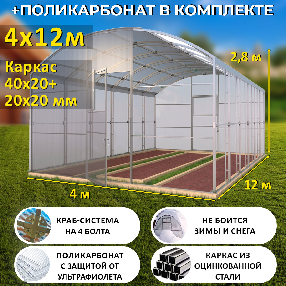 10 цен на Теплица Прямостенная (Поликарбонат в комплекте) 4 х 12 метров, оцинкованный каркас 40х20+20x20 мм - Царская Премиум