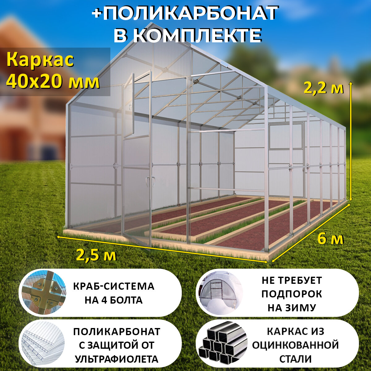 Теплица Двускатная (Поликарбонат в комплекте) 2.5 х 6 метров, оцинкованный каркас 40х20 мм - Домик Люкс информация: