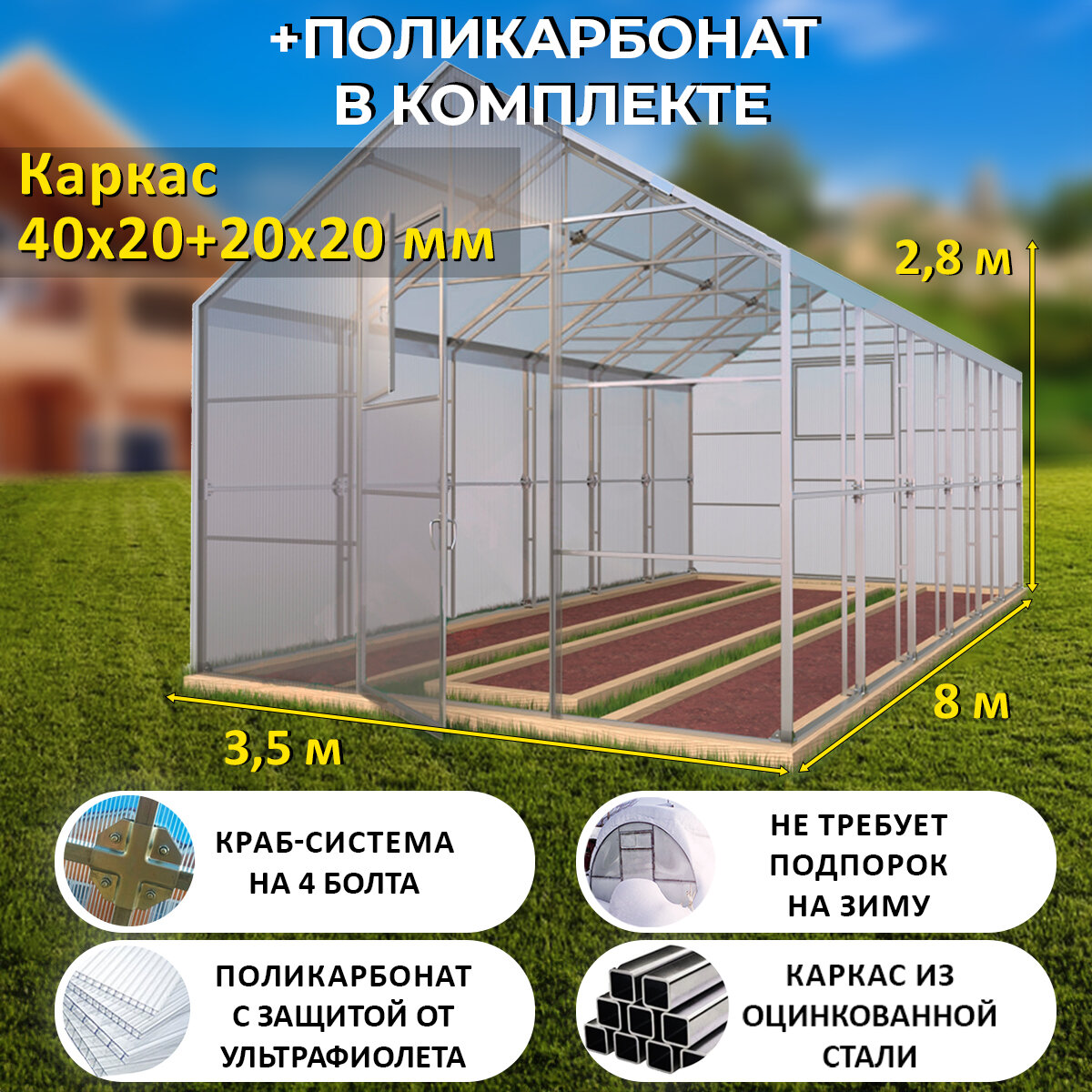 Теплица Двускатная (Поликарбонат в комплекте) 3.5 х 8 метров, оцинкованный каркас 40х20+20x20 мм - Домик Премиум информация: