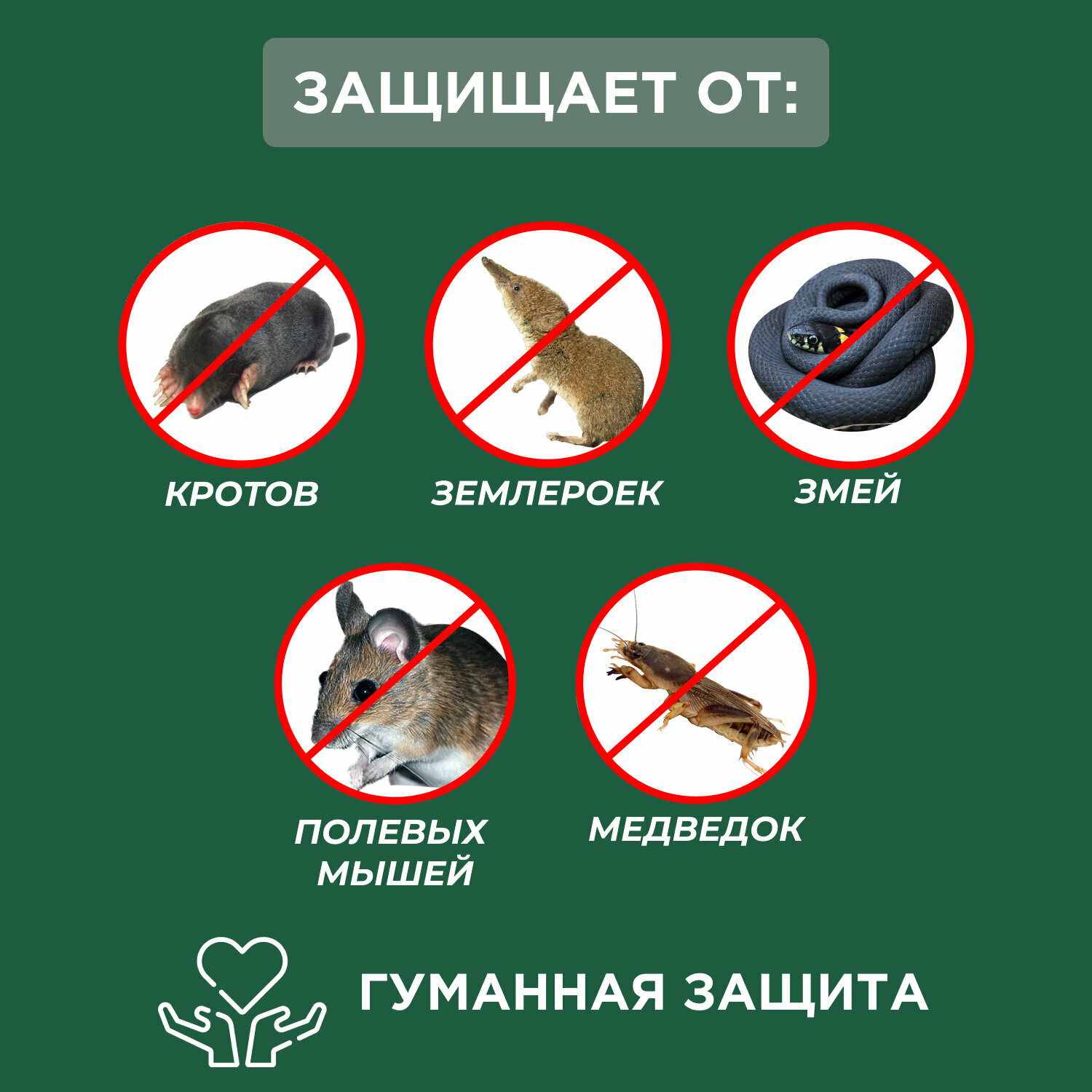 | Дополнительная информация | эффективность устройства оценивать через 2-4 недели, эффективность отпугивателя снижается в рыхлых почвах, при наличии в земле предметов высокой прочности – крупных камней, валунов, фундамента, колодезных колец и т.д. |