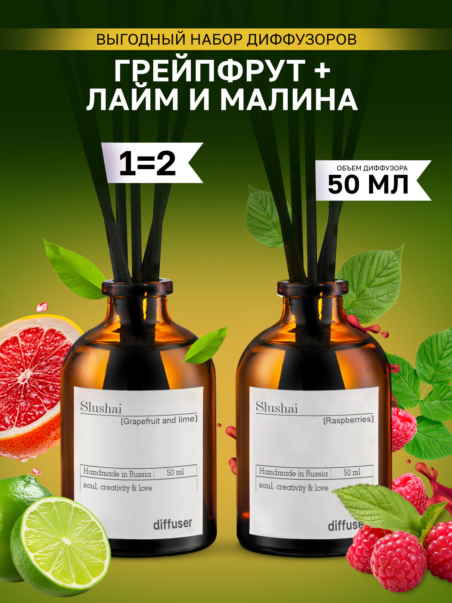 Набор ароматических диффузоров Грейпфрут и лайм + Малина / ароматизатор для дома с палочками 2 шт информация: