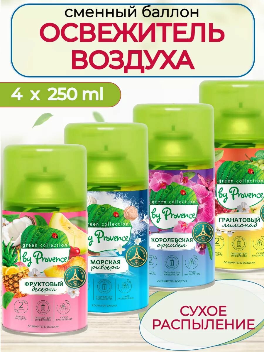 Набор 4 штуки освежитель воздуха автоматический Green collection by Provence сменный блок (4 баллона) фруктовый десерт, морская ривьера, королевская орхидея, гранатовый лимонад информация: