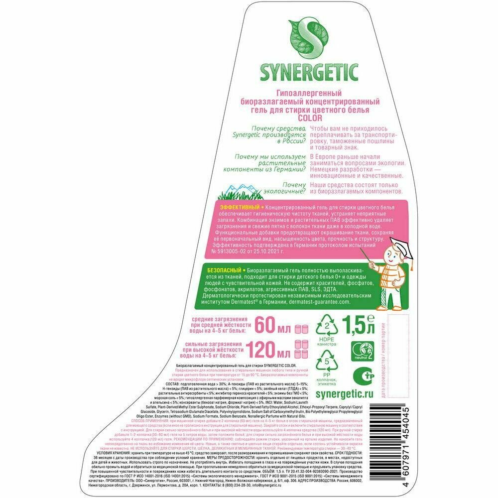 Гель для стирки Synergetic Сolor, 1.5 л, бутылка информация: