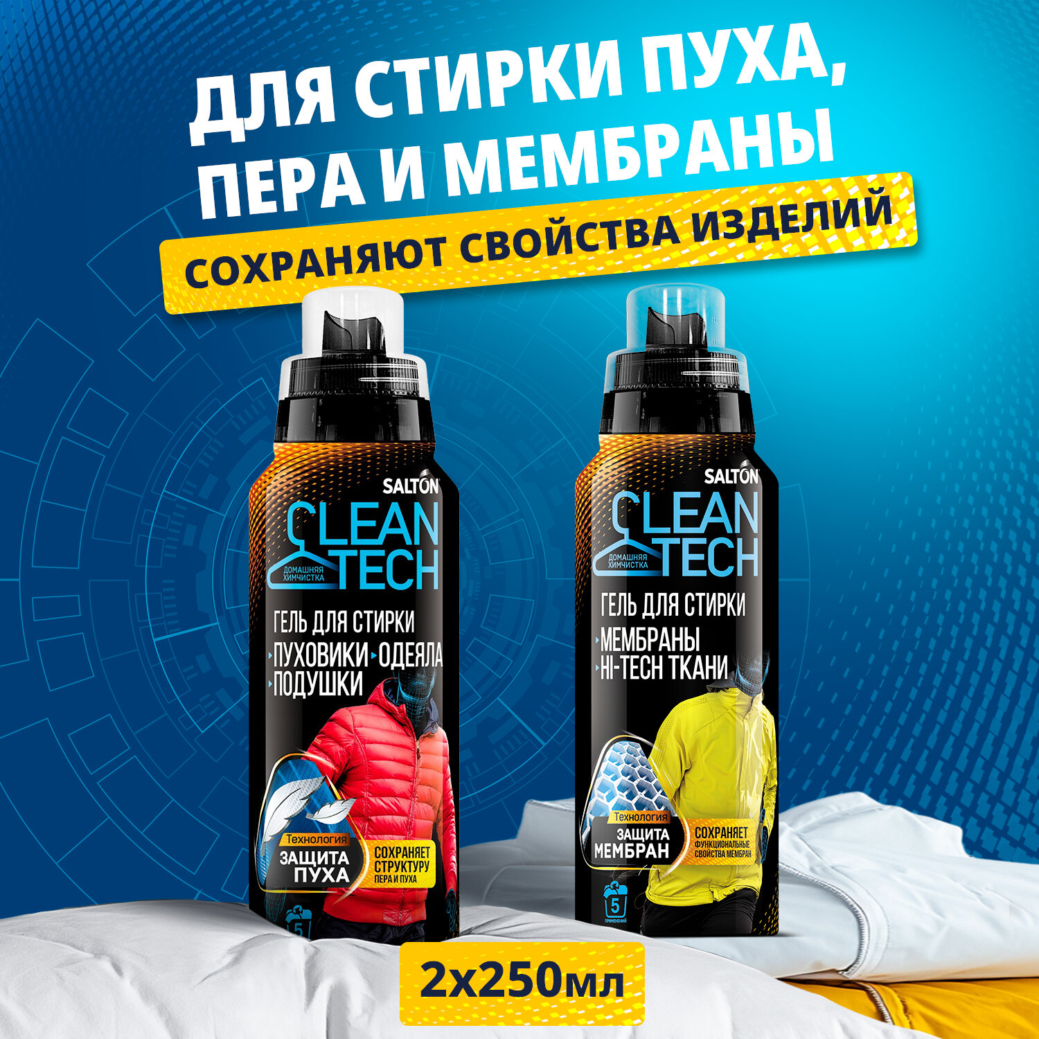 Salton CleanTech Набор Гель для стирки мембраны, мембранной одежды 250 мл + Гель для стирки пуховиков, курток 250 мл информация: