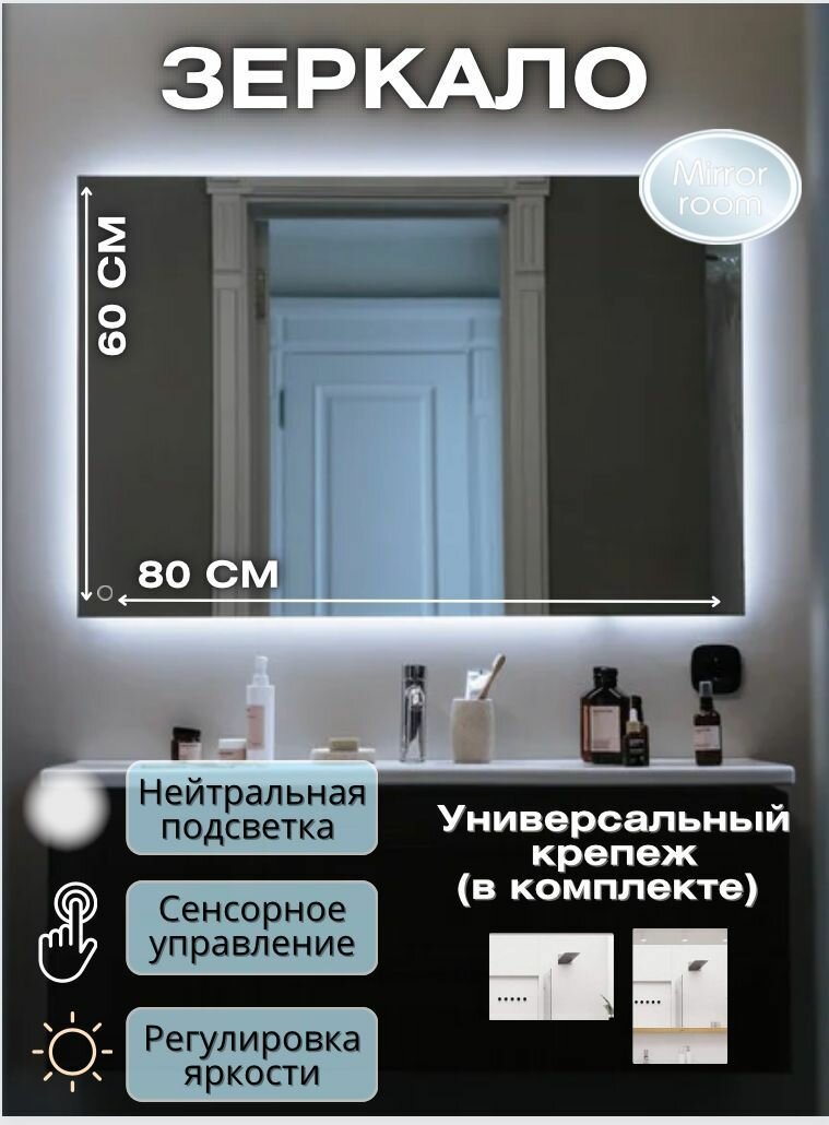 Зеркало для ванной прямоугольное с подсветкой 4500 К (нейтральный свет) и сенсорным управлением размер 60 на 80см. информация:
