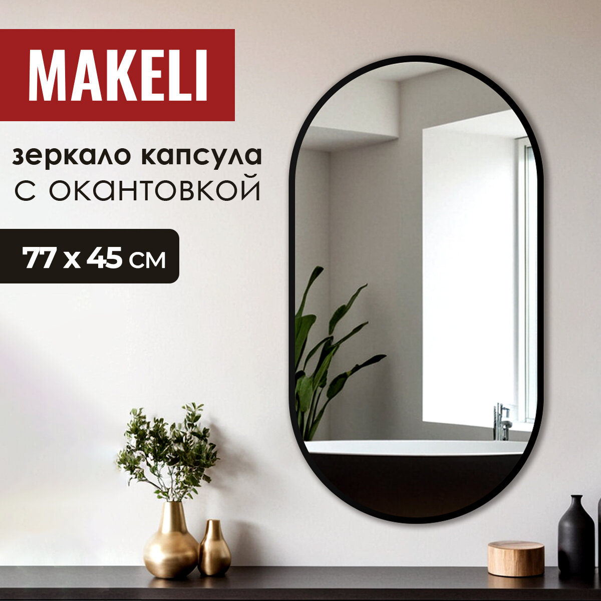 Настенное зеркало MAKELI 77х45 с черной окантовкой, капсульной формы 3 150 ₽
