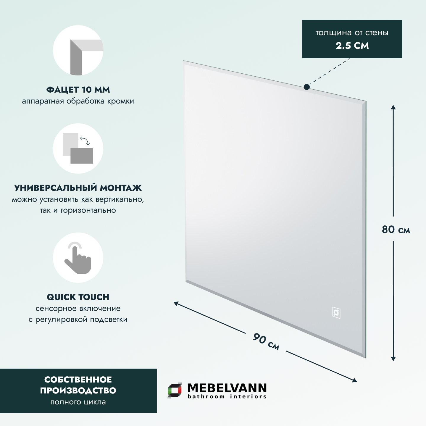 Зеркало с подсветкой орвието 80х90 см для ванной холодный белый свет 6000К сенсорное управление информация:
