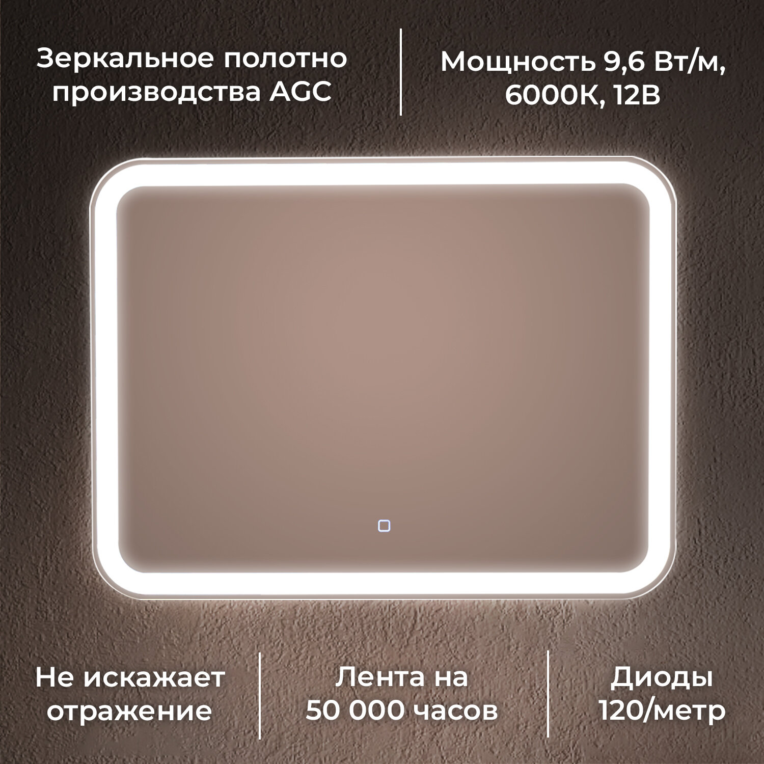 Зеркало настенное для ванной КерамаМане 70*100 см с холодной подсветкой 6000 К с сенсорной кнопкой