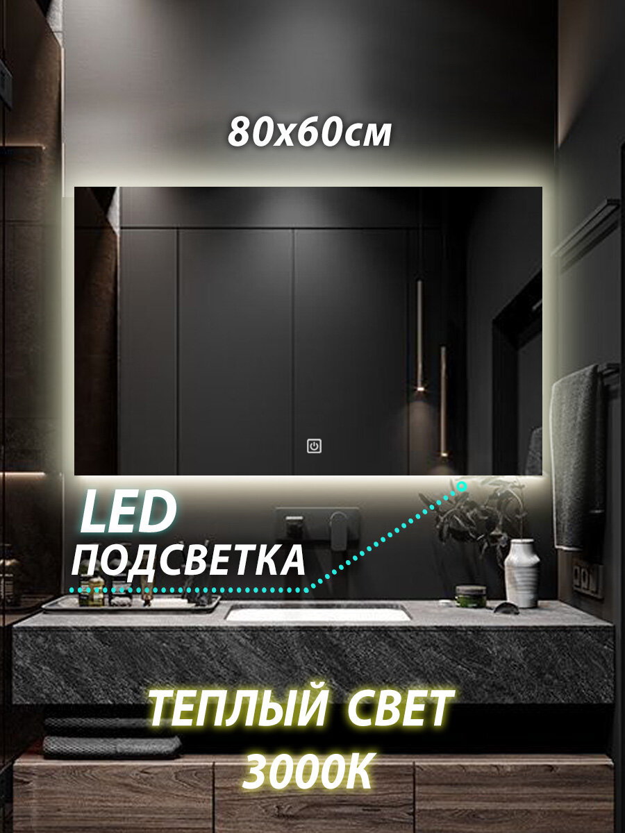 Зеркало настенное для ванной КерамаМане 80*60 см с тёплой подсветкой 3000 К с сенсорной кнопкой информация: