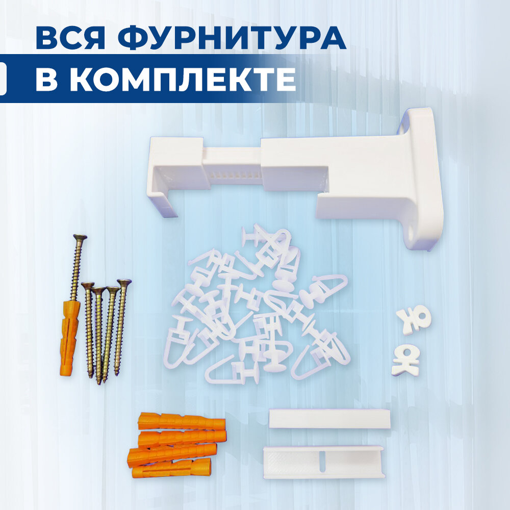 | Комплектация | Комплект состоит: составные шины длиной 1м или 1,2м; внутренние и внешние соединители, торцевые заглушки (стопор) - 4 шт; крючки — из расчета 1 шт. на каждые 10см карниза; дюбели и саморезы. |