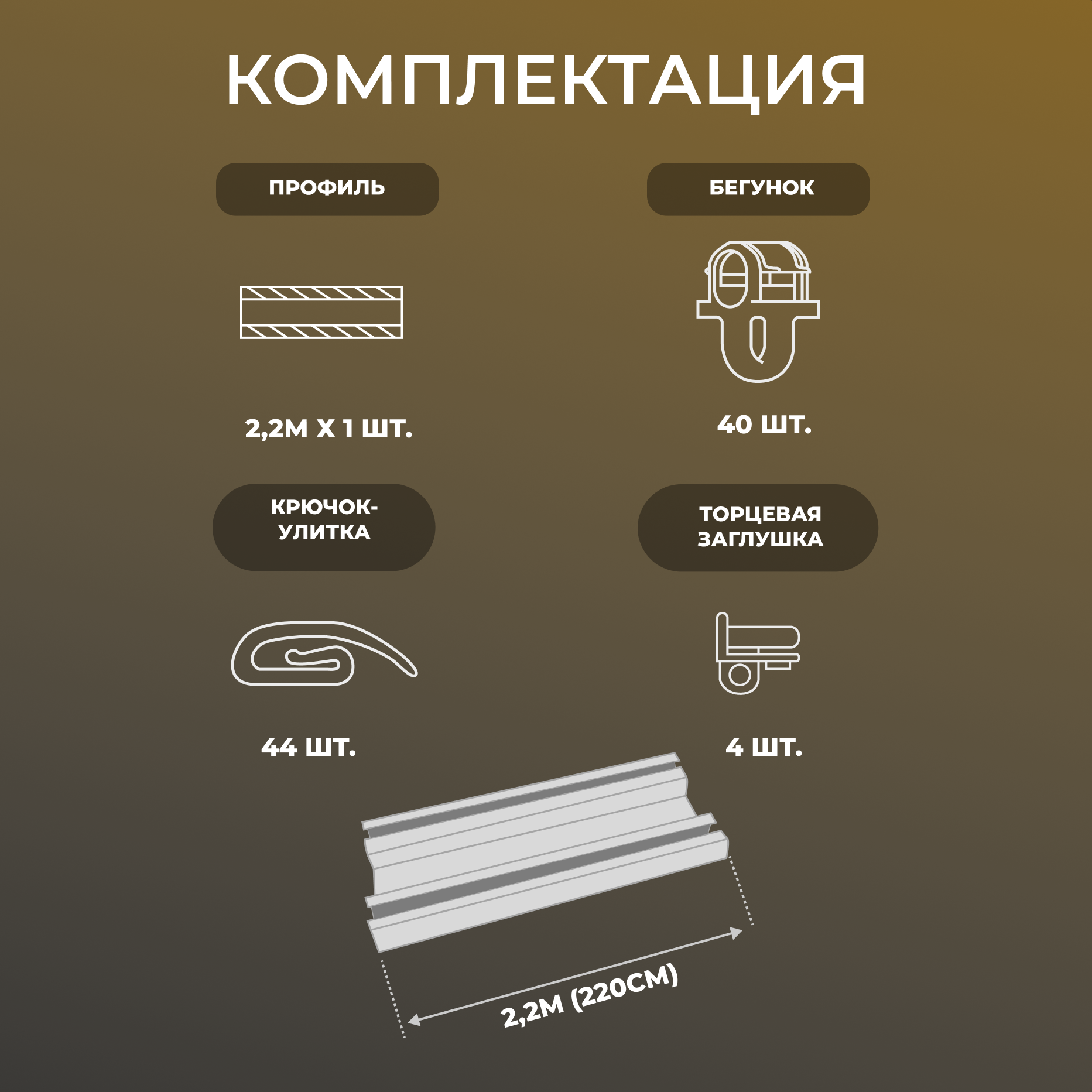 | Комплектация | Профиль алюминиевый D6 - 1 шт; заглушка торцевая для профиля (4 шт); бегунок; крючок французский |