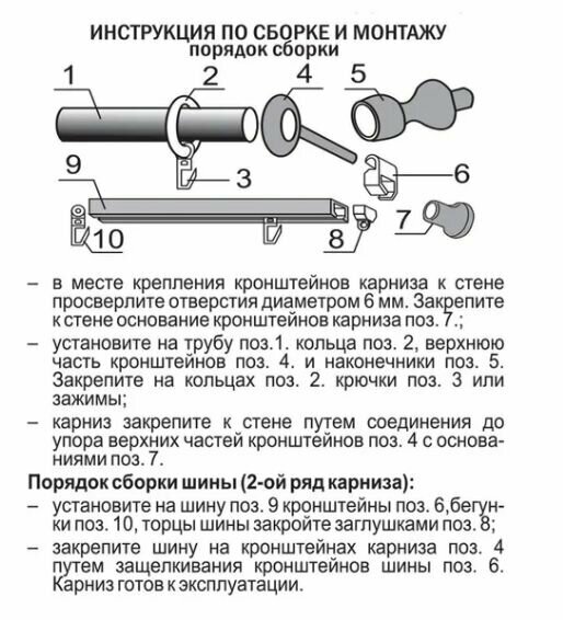 | Комплектация | труба;стальная у–шина,крючок для кольца и у-шины ( прозр. ),держатель у–шины ( прозр. ),заглушки у–шины ( прозр. ),настенные кронштейны,кольца,наконечники,дюбель–гвоздь |