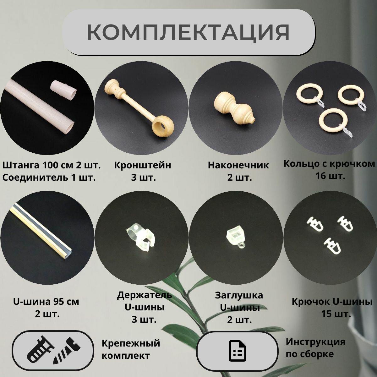 | Комплектация | Штанга металлическая D28мм, 120 см - 2шт.; Соединитель штанги -1шт. U-шина металлическая, 115 см - 2шт.; Кронштейн дерево - 3шт.; Наконечник дерево - 2шт.; Кольцо дерево - 20шт.; Крючок для кольца пластик 20шт.; Держатель U-шины пластик - 3шт.; Заглушка U-шины пластик - 2шт.; Крючок для U-шины - 19шт.; Крепежный комплект - 1шт. Инструкция по сборке - 1шт. |