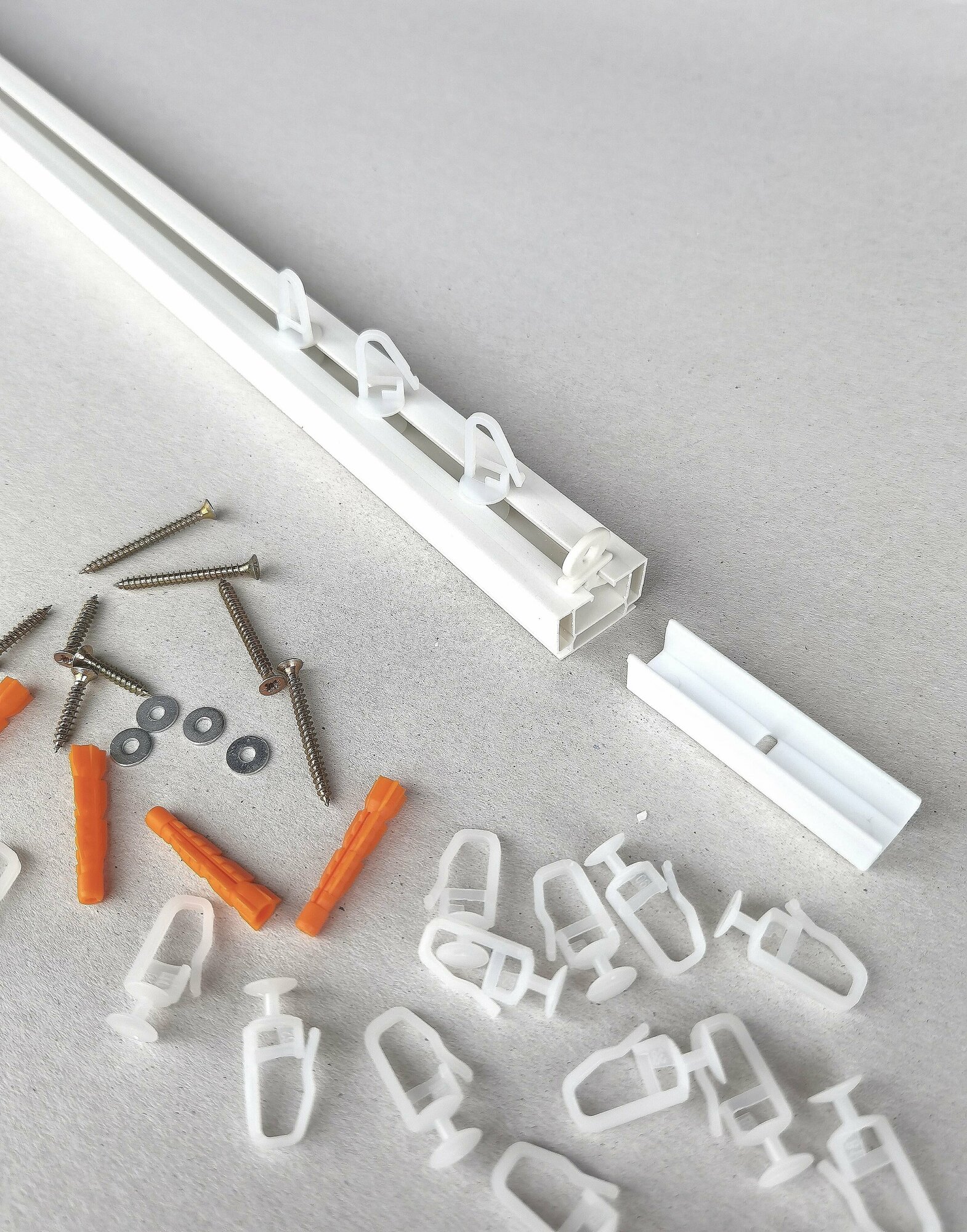| Комплектация | Комплект состоит из: составные шины длиной 1 либо 1,2м; торцевые заглушки (стопор) - 2 шт; крючки — из расчет 1 шт. на каждые 10см карниза; дюбели; саморезы 2 вида (16 и 42мм); шайбы усилительные. |