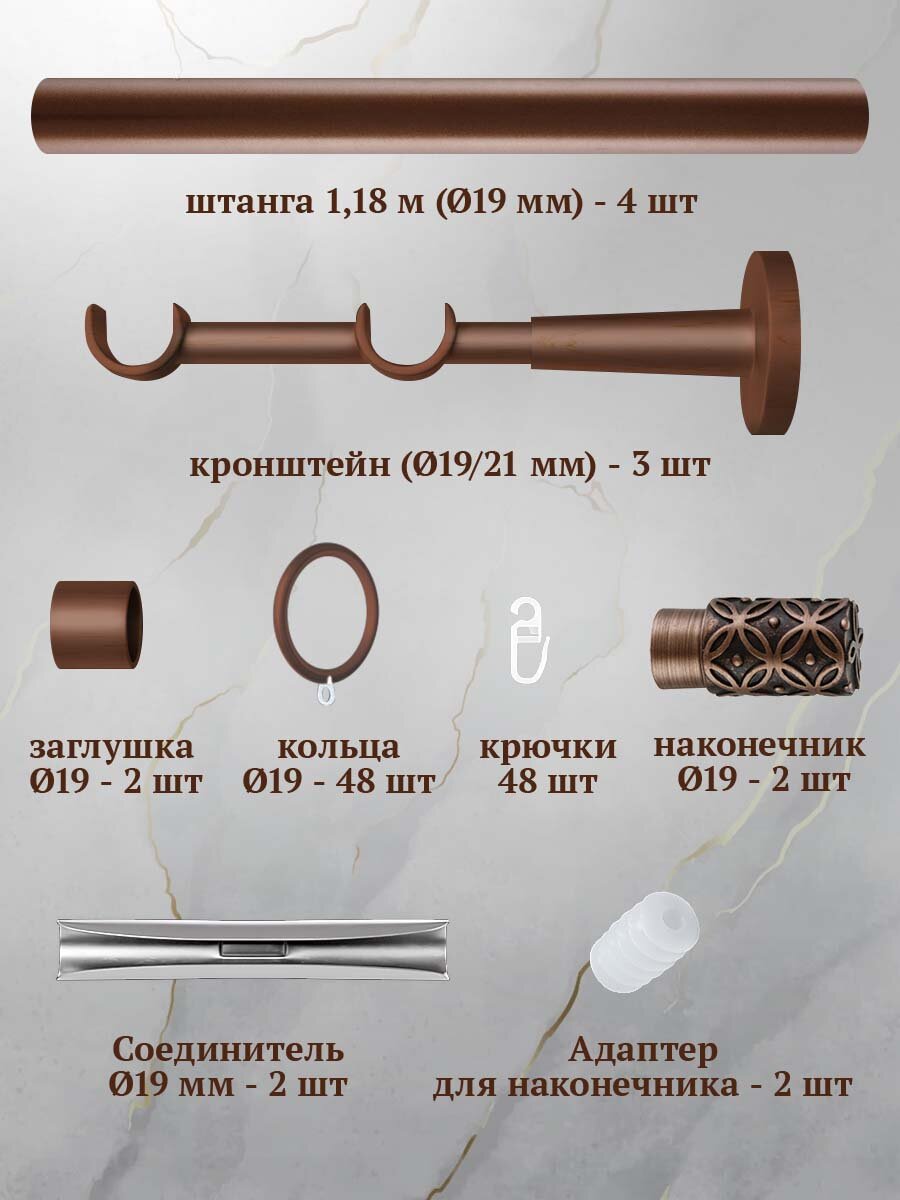 | Комплектация | Штанга длина 118 см - 4 шт;Кронштейн двойной 21см 19мм/19мм - 3 шт;кольца на карниз - 48 шт, крючки для колец - 48 шт;наконечник на карниз - 2 шт, адаптер - 2 шт, заглушки на карниз - 2 шт;комплект крепежей, инструкция по установке |