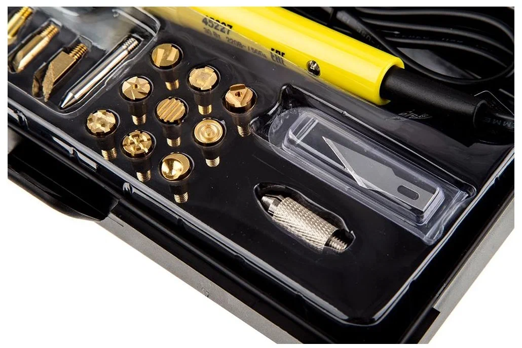 | Подробная комплектация | 20 насадок для нанесения различных типов изображений на поверхность дерева, кожи и др. материалов; Нож для терморезки (2 насадки); Пластиковый кейс с прозрачной крышкой для удобства выбора и безопасного хранения изделия и насадок; Легкая и эргономичная пластиковая рукоятка с неподвижным упором для фиксации прибора на подставке; Металлическая подставка. |