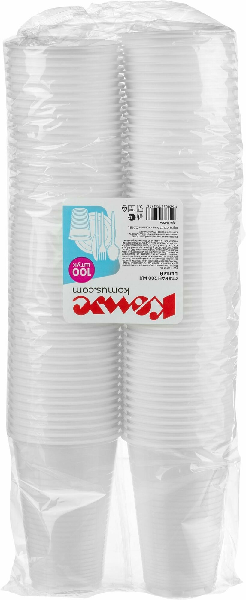 Стаканы одноразовые Комус пластиковые, 200 мл, 100 штук, белые информация: