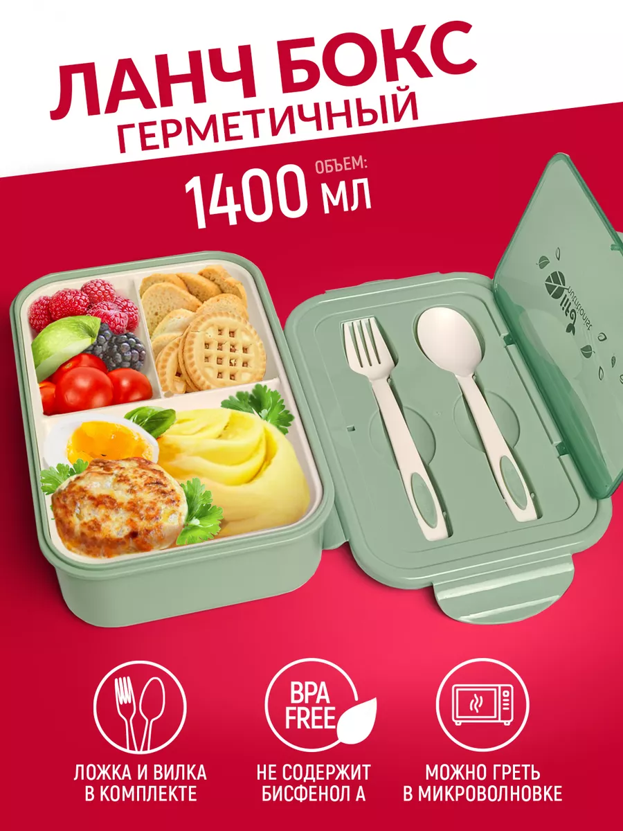 Burrg Ланч-бокс с отделениями и столовыми приборами 1400 мл мятный, герметичный пищевой контейнер информация:
