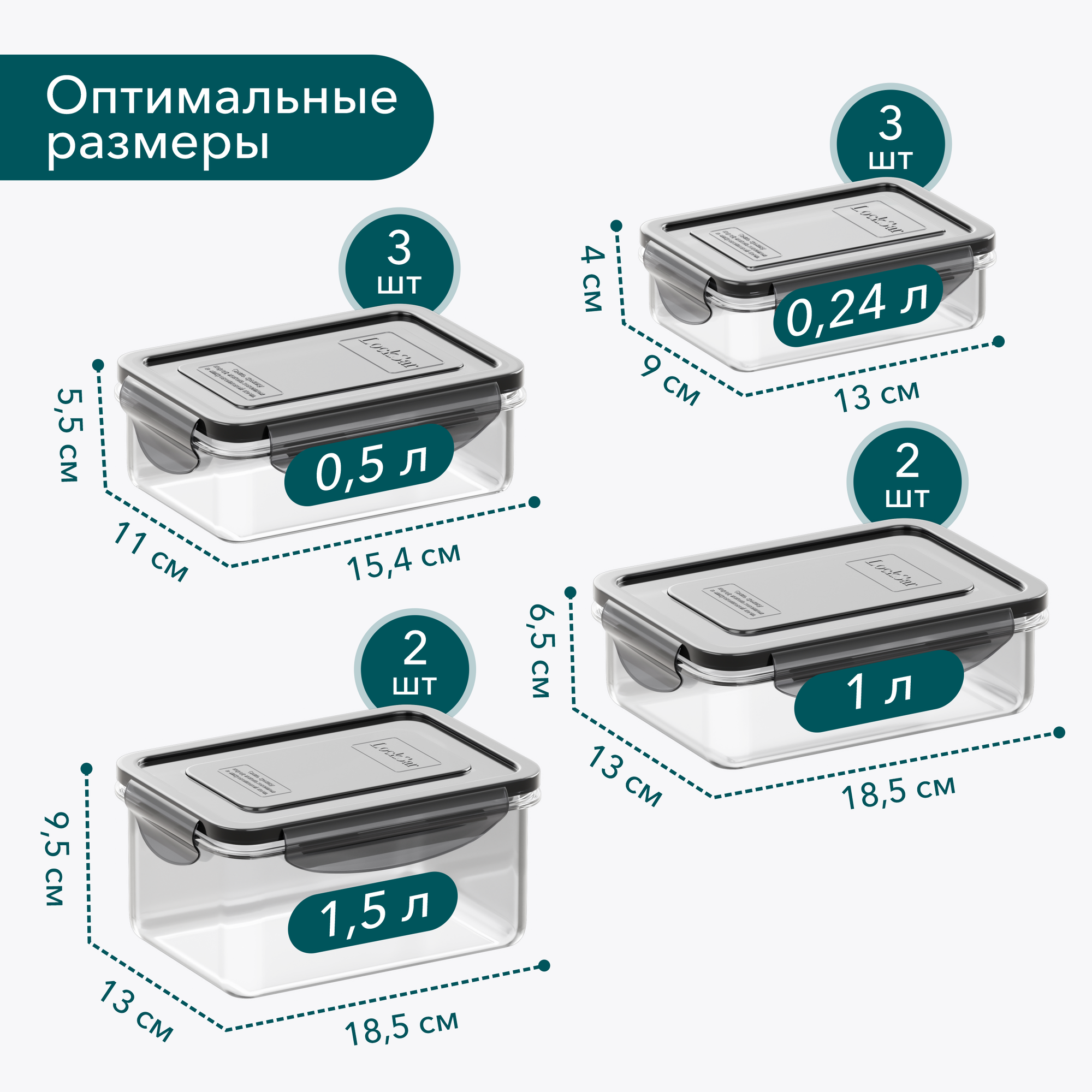 Контейнер для еды герметичный 10 шт LockSar набор контейнеров для хранения продуктов 0,24 л - 3 шт; 0,5 л - 3 шт; 1 л - 2 шт; 1,5 л - 2 шт цвет дымчатый 1 360 ₽
