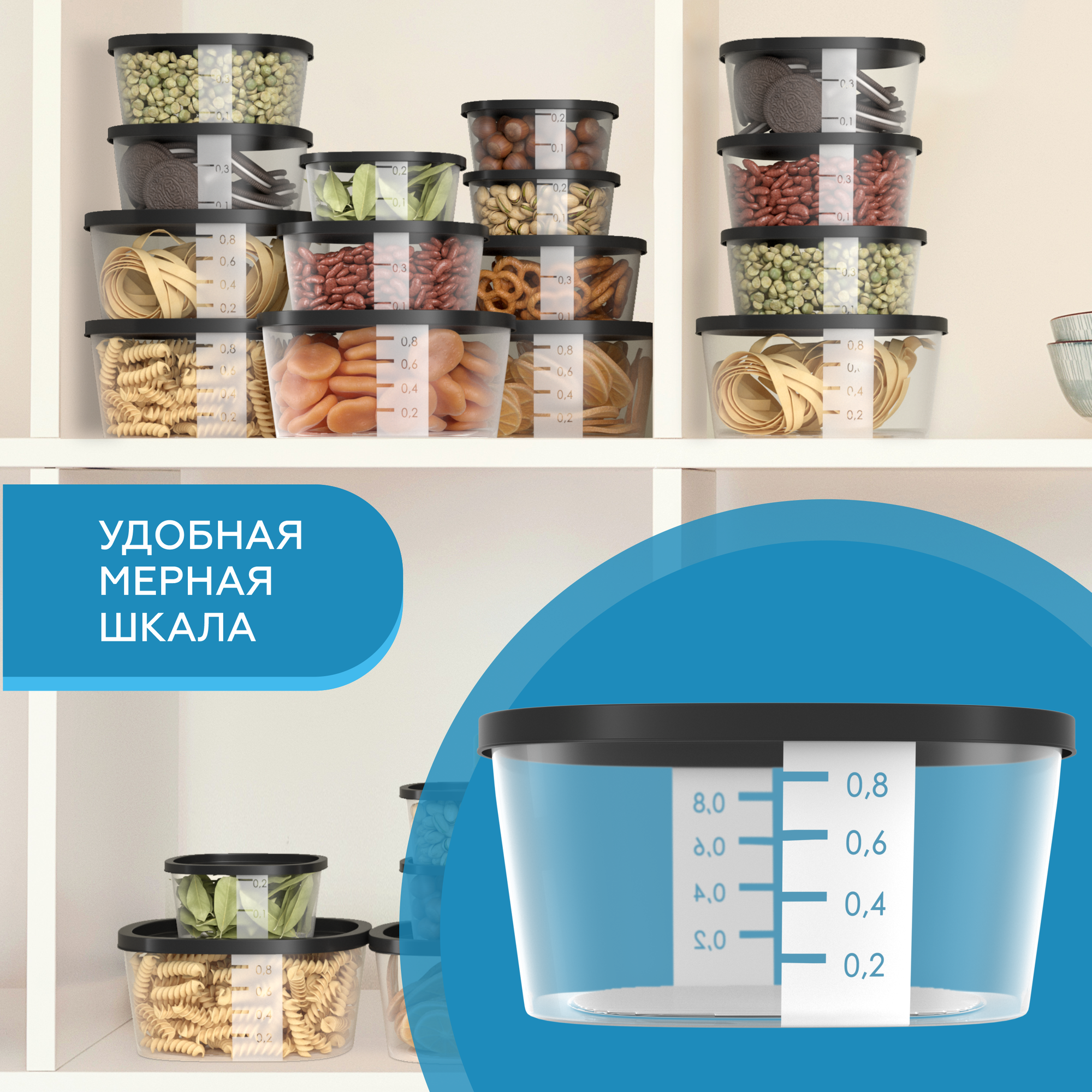 Контейнер для еды и хранения продуктов 18 шт good&good 0,9л - 5 шт, 0,5л - 6 шт, 0,23л - 7 шт, черные крышки информация: