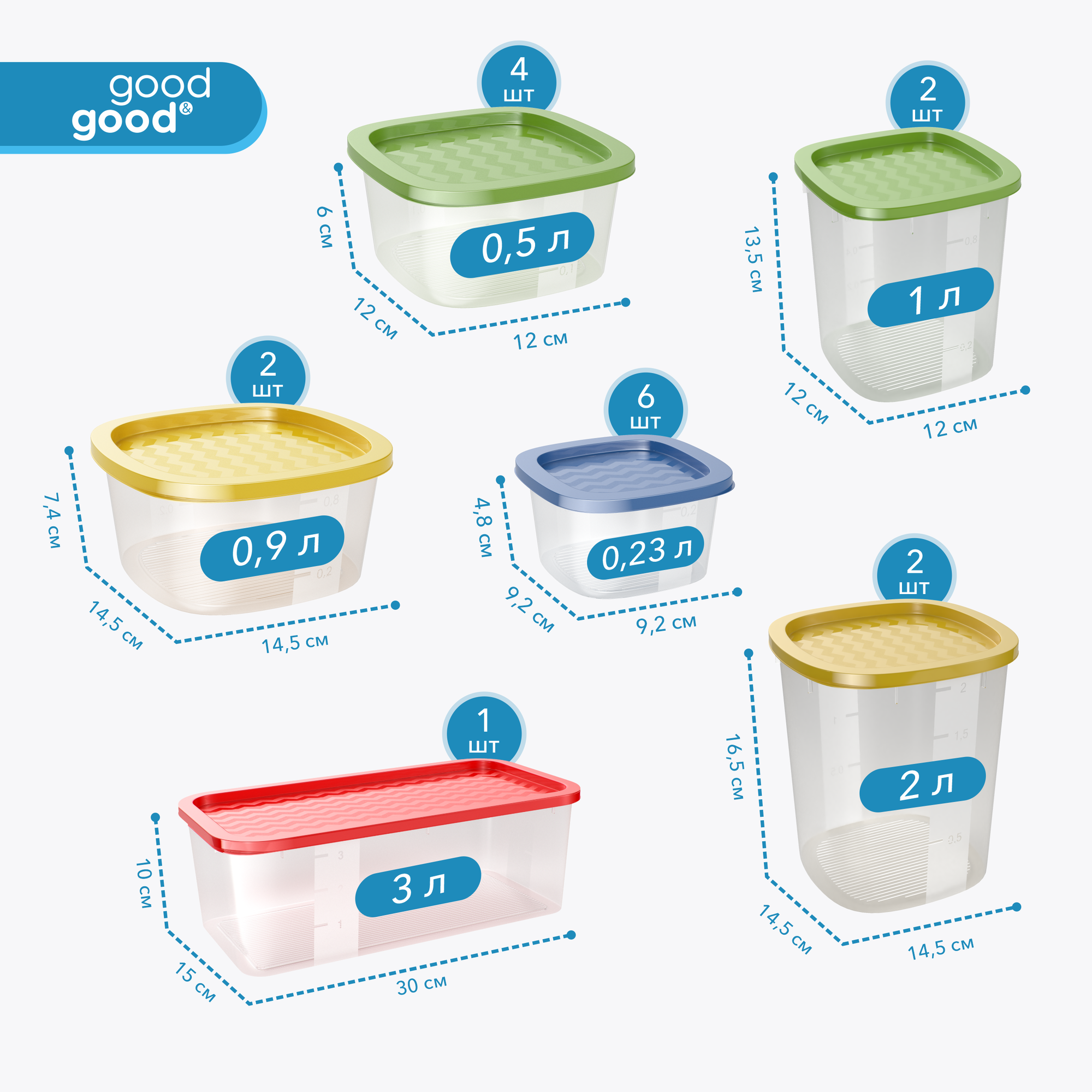 Контейнер для еды и хранения продуктов 17 шт good&good 0,23 л х 6 шт; 0,5л х 4 шт; 0,9л х 2 шт; 1,0л х 2 шт; 2,0л х 2 шт; 3,0л х 1 шт информация: