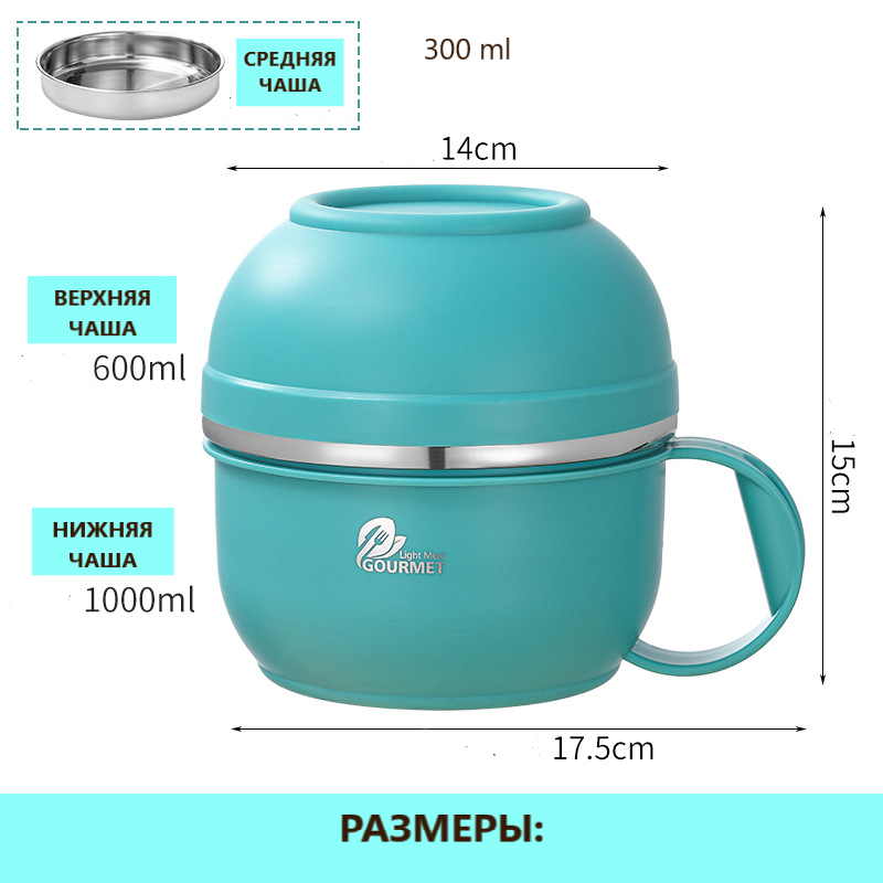Lunch Box с тремя термо-контейнерами герметичными металл. отделениями для еды, супа, с термо-сумкой для школы 1.4л. Сталь внутри