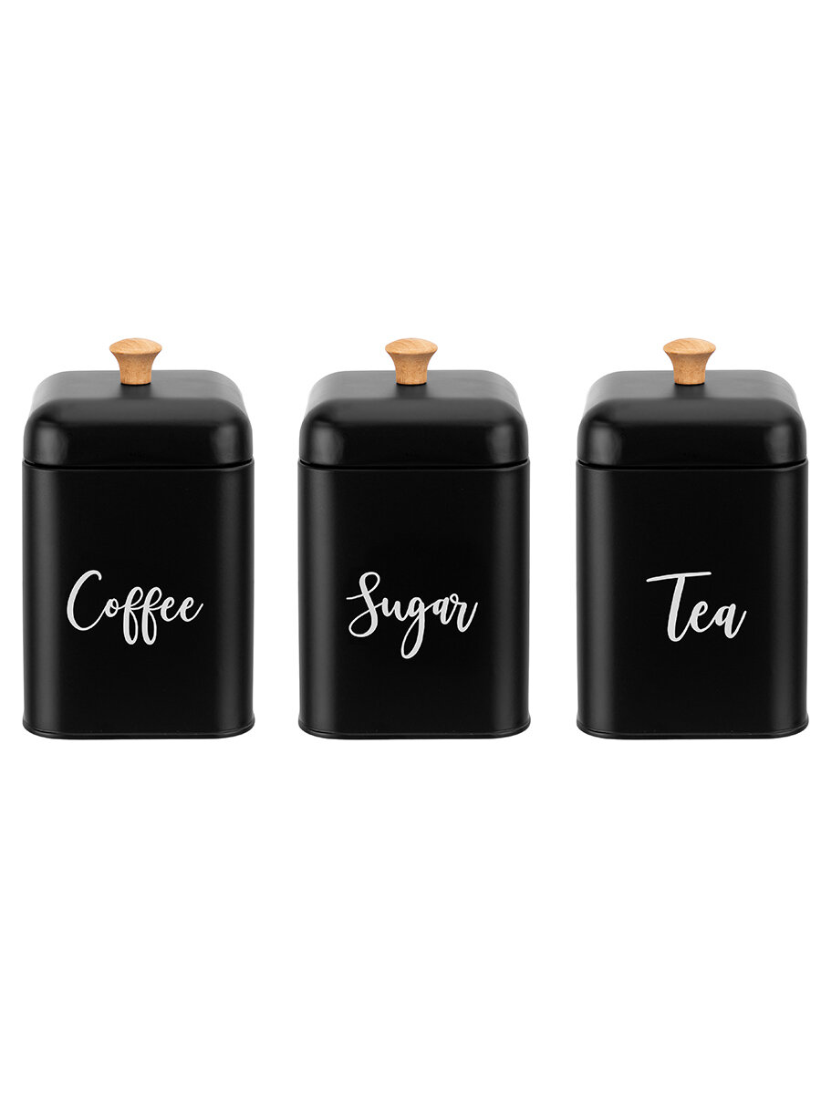 Банка для хранения сыпучих продуктов/ чая, кофе, сахара 3 шт 1,5 л Elan Gallery"Tea, coffee, sugar" с крышками, черный, набор информация:
