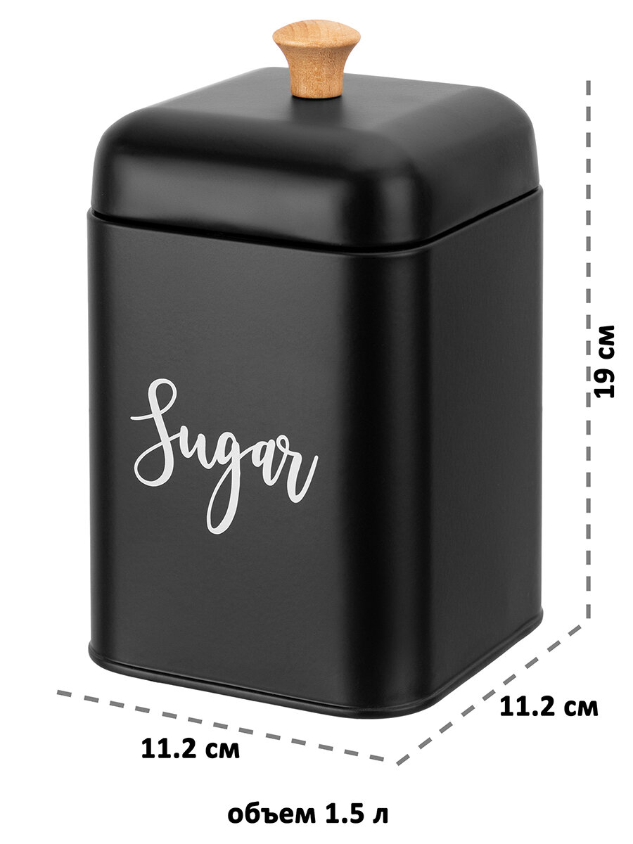 | Дополнительная информация | Набор 3 банок для сыпучих продуктов "Tea, coffee, sugar" с крышками, черный, 11,2х11,2х19 см 1,5 л - каждая, высота без крышки 13,5 см, металл. Не рекомендуется использовать абразивные моющие средства. |