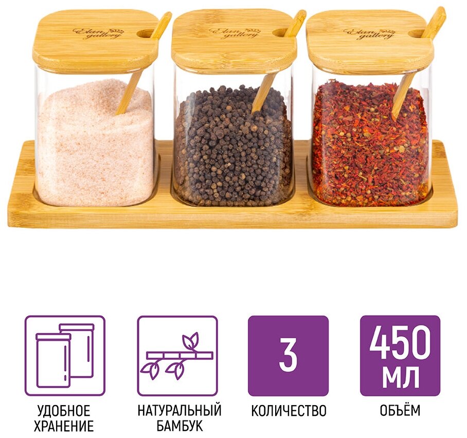 10 цен на Набор банок для специй 3 предмета Elan Gallery Crystal glass, с бамбуковыми крышками, с ложками, на бамбуковой подставке450 мл 29х9,5х11,5 см
