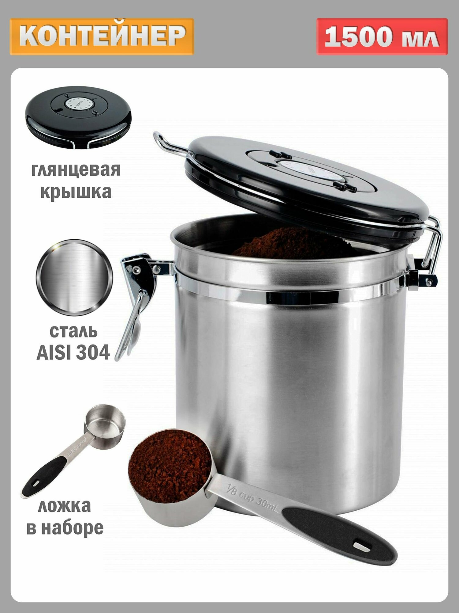 Контейнер с мерной ложкой для хранения кофе, чая и других сыпучих продуктов. Герметичный, с таймером, с обратным клапаном - нержавеющая сталь, 1800 мл