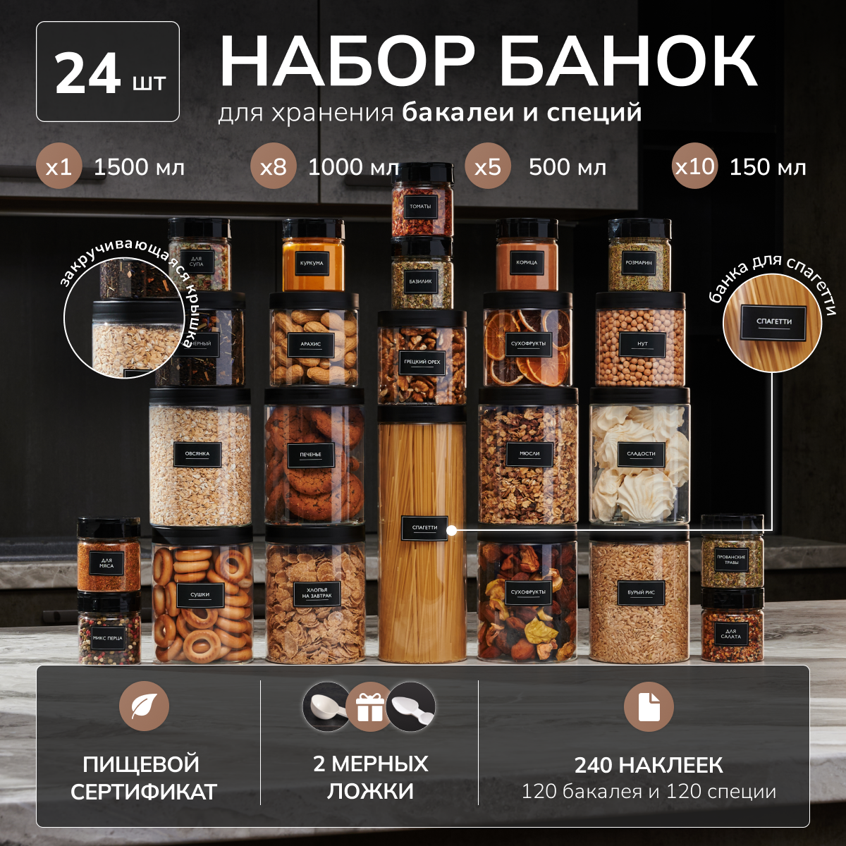 | Дополнительная информация | Набор баночек для порядка на кухне: 7 шт для специй и приправ, 10 шт для бакалеи, 1 шт для спагетти. Баночки позволят убрать визуальный шум , а также вы всегда будете знать какой продукт в каком количестве. |
